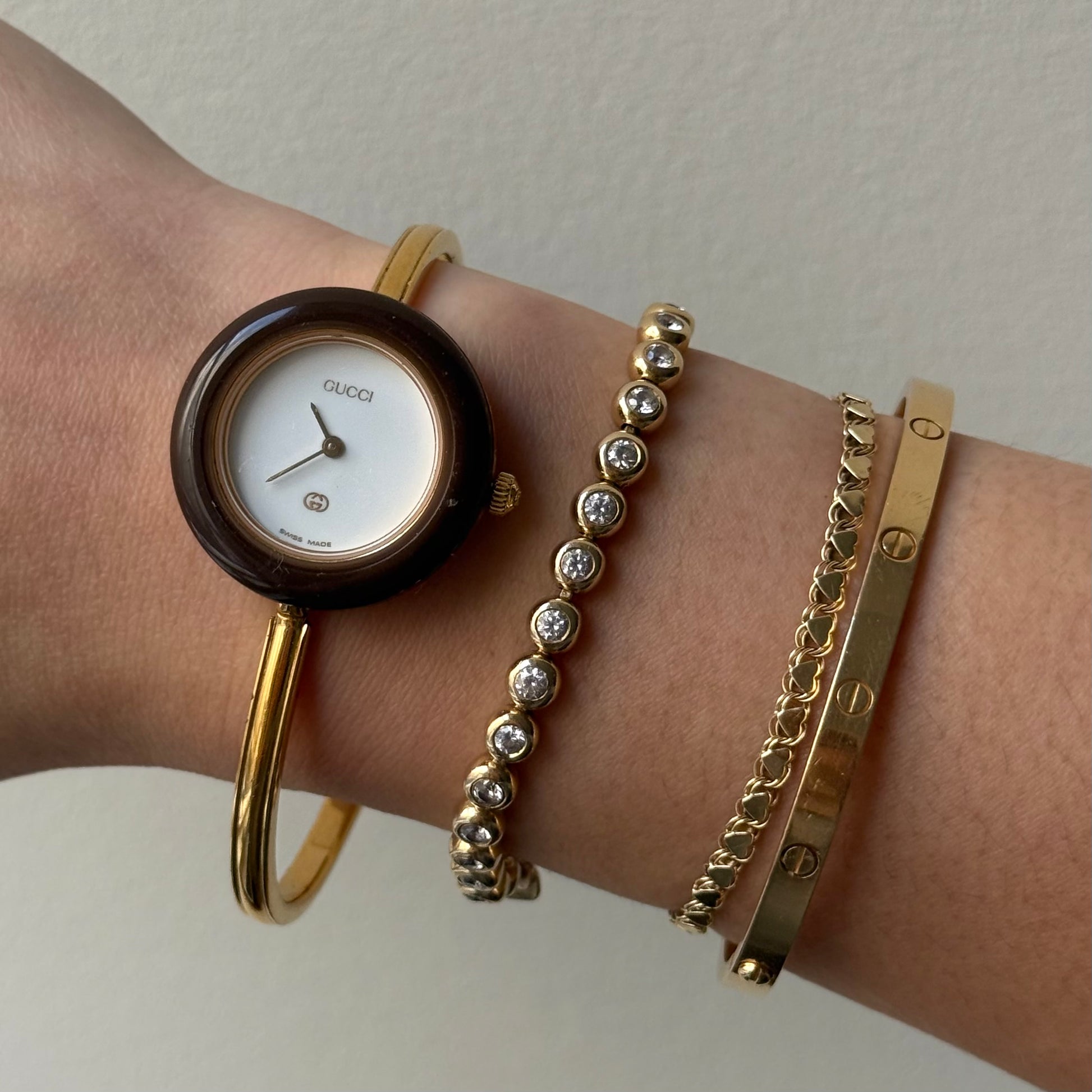 Gucci Gold Bangle Bezel Watch w/ 11 interchangeable Bezels & Box