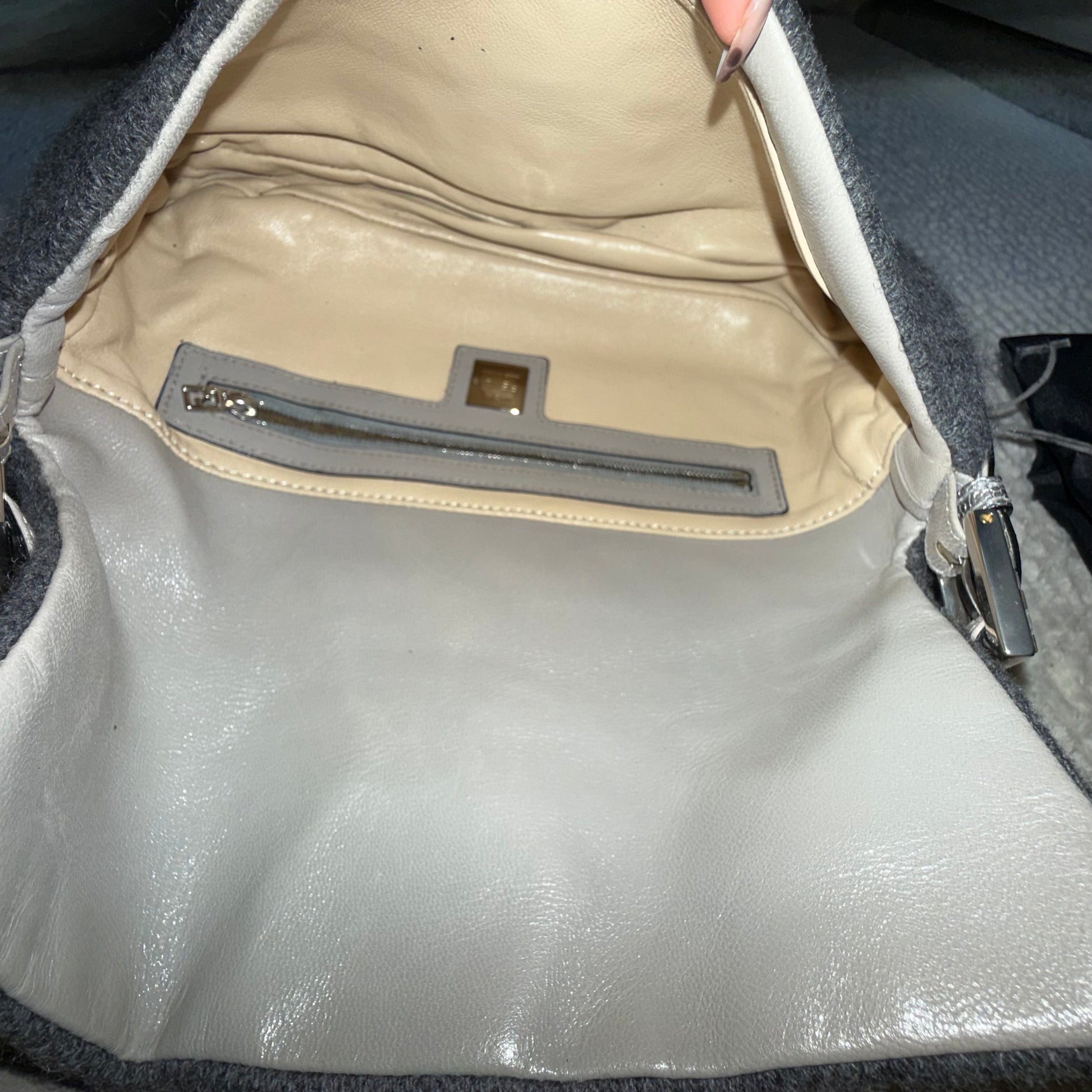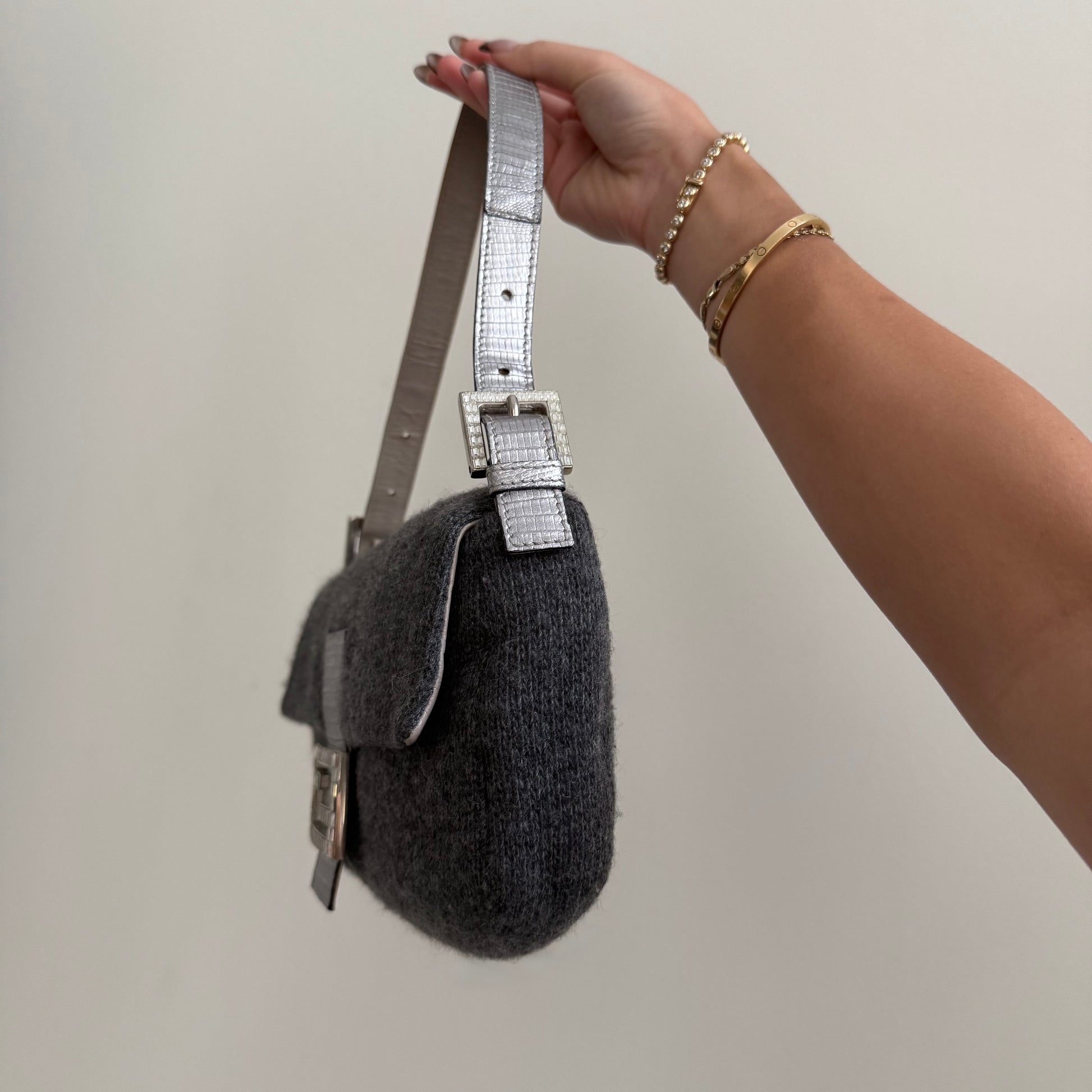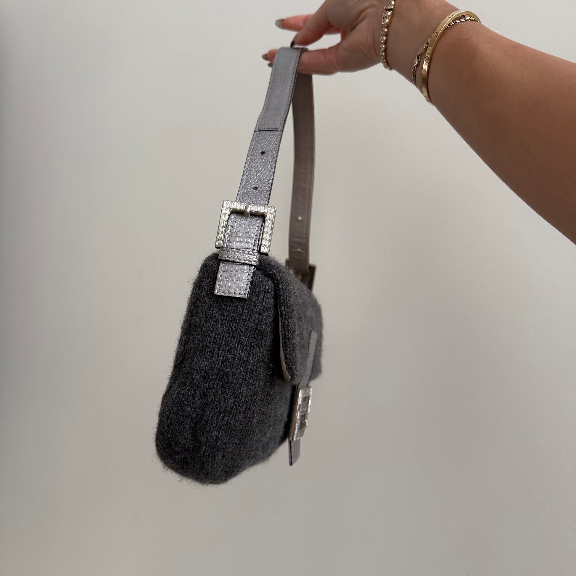 RARE Fendi Gray Cashmere Wool Lizard Trim Rhinestone Baguette